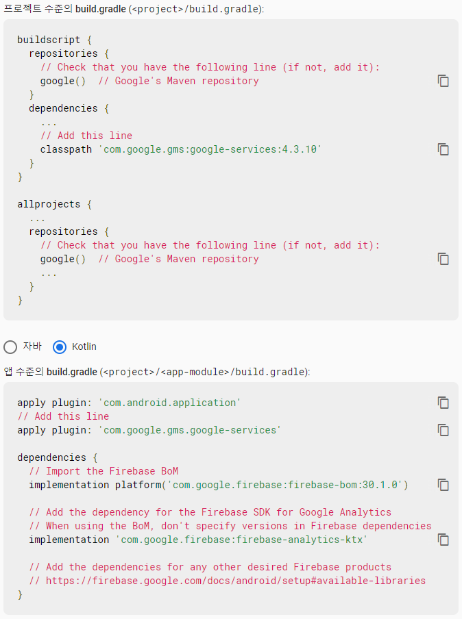 | [Firebase] Android Gradle 연동 문제 - build gradle plugin id com.google.gms:google-services (0) | 2022.05.31 |